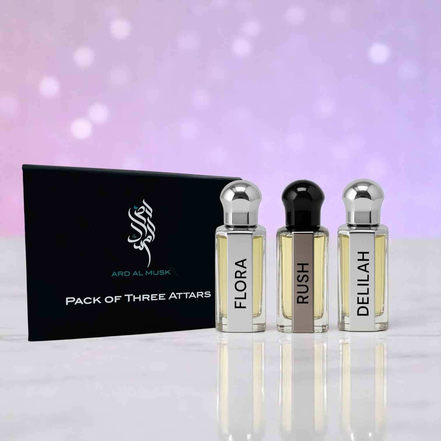 Choose any 3 from our best-selling non-alcoholic perfume oils – Rush, Flora, Bella, or Delilah – in elegant 6ml bottles.